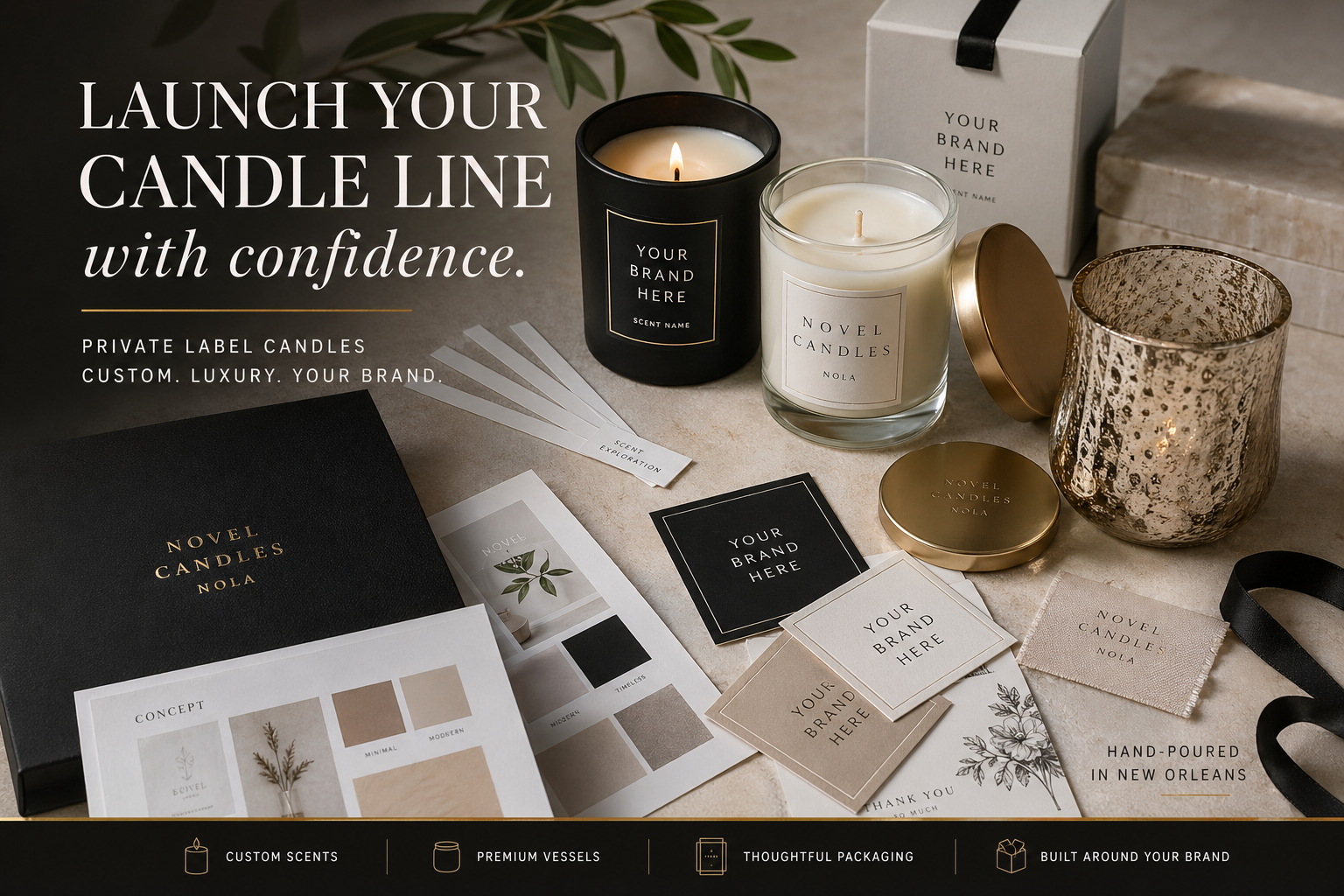 Custom candles for boutiques, brands, events, hotels, gifting, and retail — hand-poured in New Orleans and built to feel like your brand from day one.